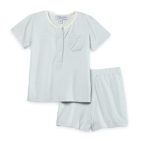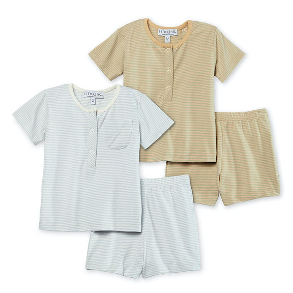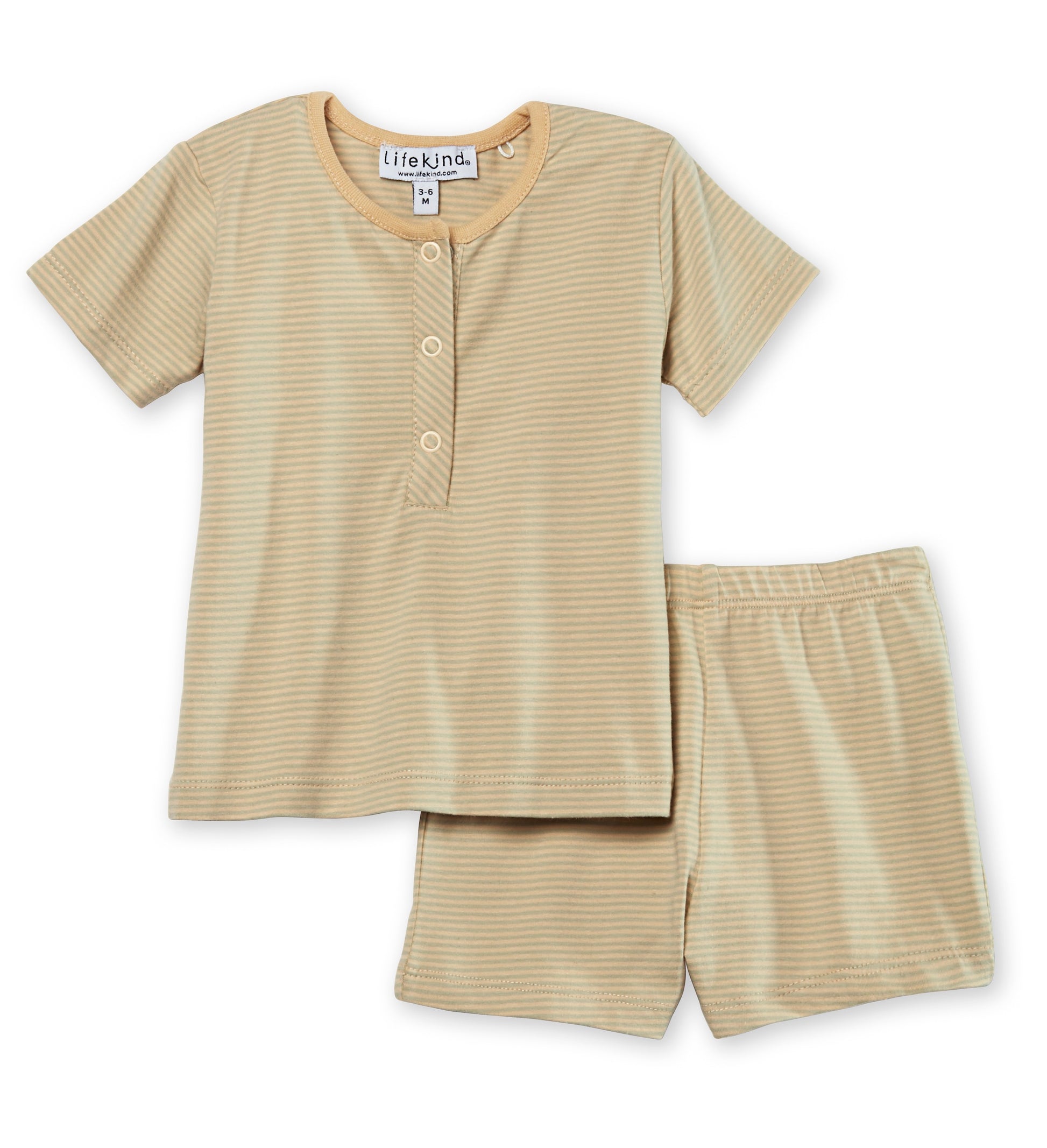 Our exclusive-design, certified organic cotton t-shirt and shorts set feature quick snaps, a lapel pocket and contrasting rib knit crew collar on the shirt, and an elastic-waist-band short.